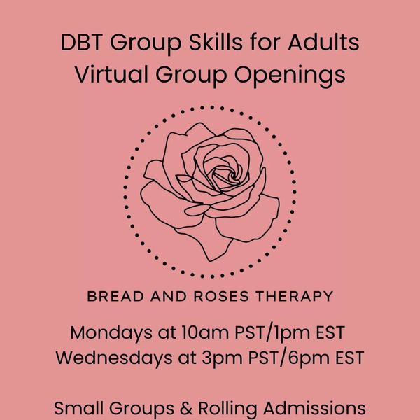 Virtual Adult DBT Skills Group for clients in Pennsylvania and Oregon. DBT Group has rolling admission, is priced at $60/session (although sliding scale is available), have 2 co-leaders and have 8 participants maximum. Monday group is at 1pm EST/10am PST. Wednesday group is at 6pm EST/3pm PST. An intake is required before joining group.